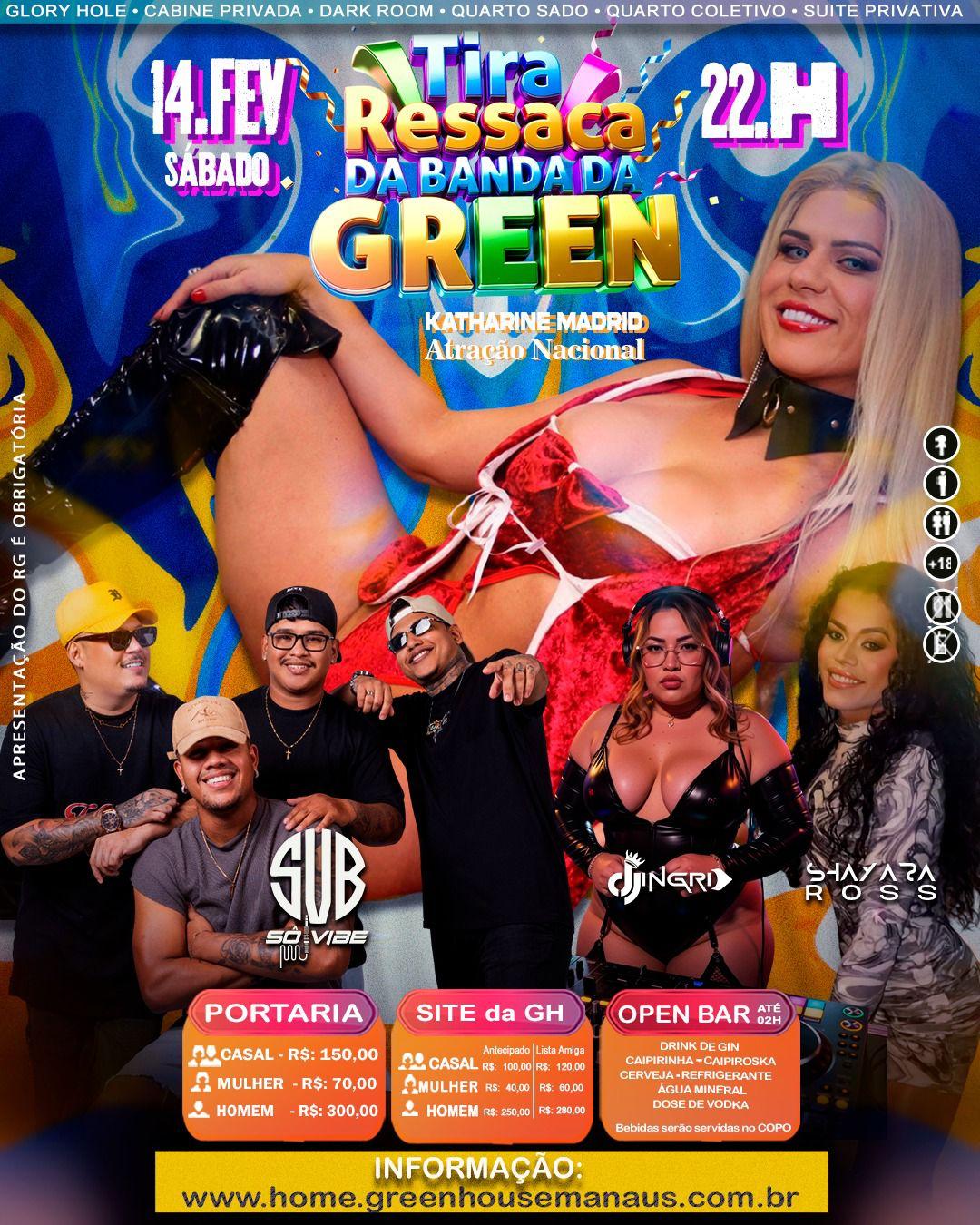 Entre os destaques está a participação da atriz de filmes eróticos Katharine Madrid, convidada para apresentações performáticas ao vivo. A agenda inclui a chamada “Tira Ressaca da Banda da Green”, uma festa pós-Carnaval, realizada no dia 14, com apresentação musical do grupo Só Vibe e discotecagem da DJ Shayara Ross, além de serviço de bar com drinks temáticos e pista de dança aberta ao público liberal previamente inscrito.