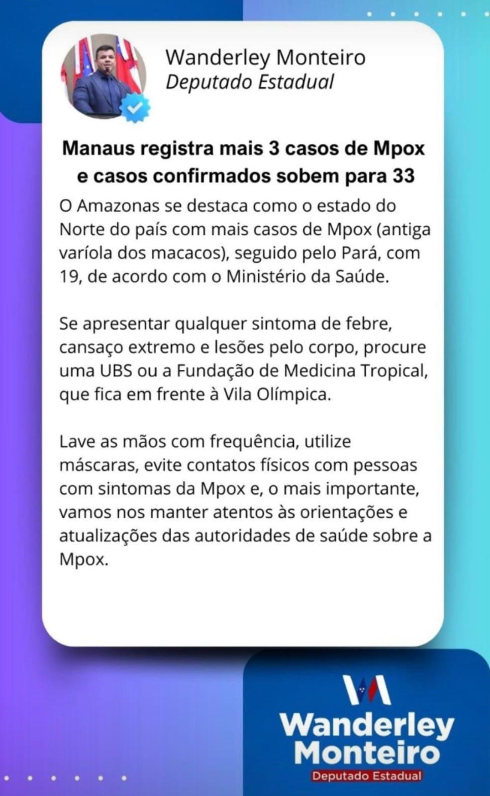 Depois de mais de um ano em absoluto silêncio nas redes sociais e longe dos debates políticos, o deputado estadual Wanderley Monteiro (Avante) reapareceu com uma nota sobre saúde pública. O motivo do retorno foi o aumento de casos de Mpox (antiga varíola dos macacos) em Manaus. Segundo o comunicado, o Amazonas lidera o ranking nacional da doença, com 33 casos confirmados, seguido pelo estado do Pará.